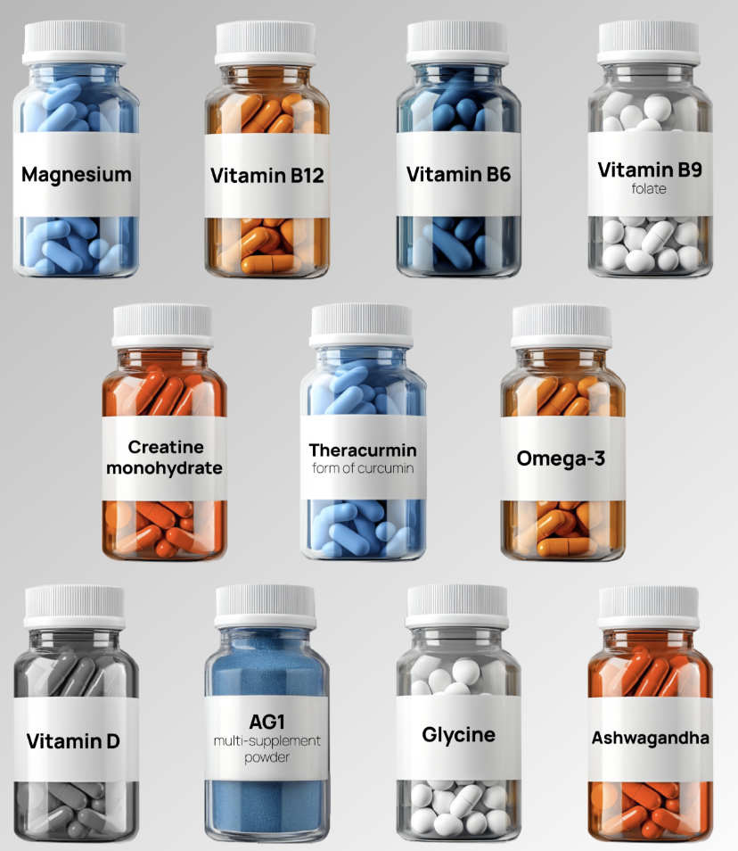 基础营养:EPA 2克 + DHA 1.5克(Omega-3),维生素D 5000 IU,叶酸和维生素B12(维持同型半胱氨酸<9),维生素B6 50mg(每周3次),肌酸一水合物5g。