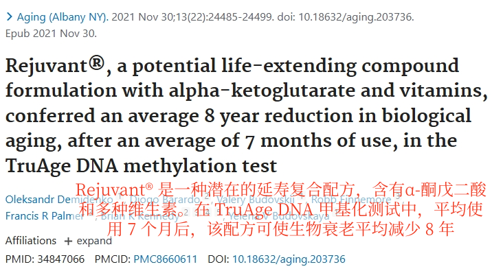 研究对象在服用了大概7个月含α-酮戊二酸和维生素的复合配方Rejuvant®后,平均生理年龄减少了约8年。