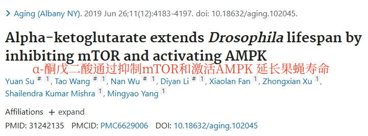 一项发表在 Aging 杂志的研究里,给果蝇饮食中加入 5 µM AKG 后,它们寿命延长约8%。③