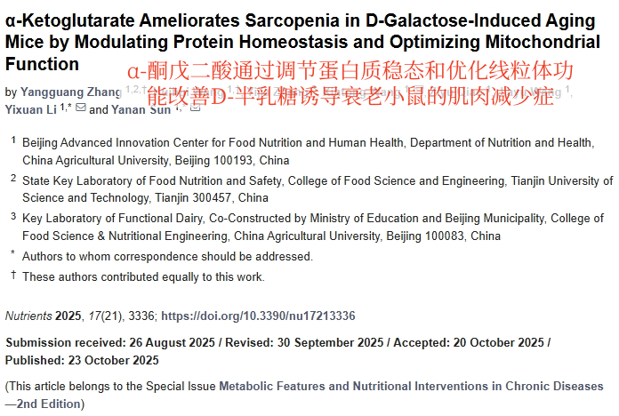在 D-半乳糖诱导的肌肉老化 (肌少症) 小鼠模型中,AKG 给药显著提高了肌肉质量、力量,并改善功能。⑤