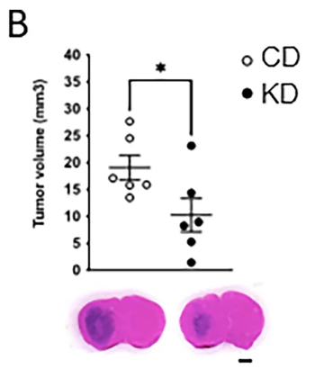 监测了小鼠体重、血糖、β-HB水平。肿瘤长大后,切脑片染色看肿瘤大小(用H&E染色,像显微镜下看地图),生存时间用曲线统计(谁活得长)。