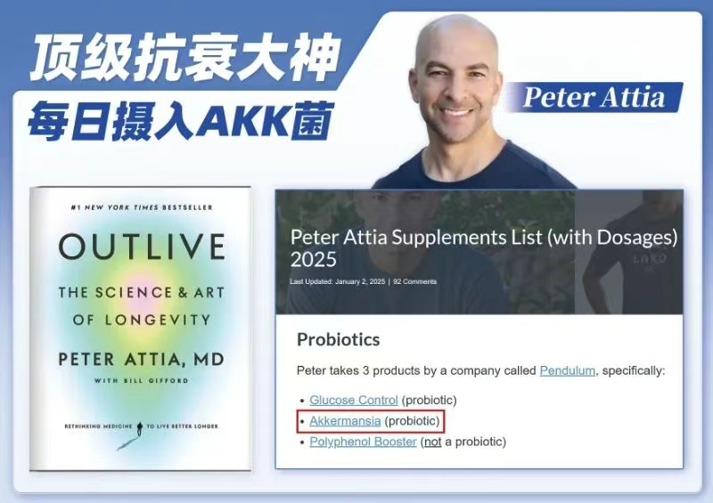 美国斯坦福医学博士、现象级畅销书《超越百岁》作者、著名的抗衰大神彼得·阿提亚(Peter Attia)在他最新的私人营养补剂清单中,就提到了AKK菌。