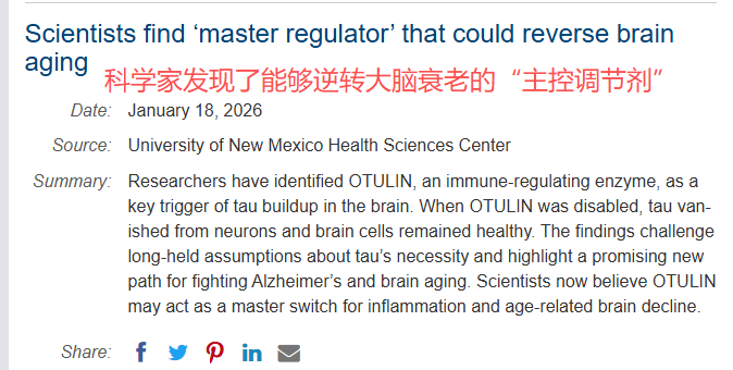 ScienceDaily上的研究发现一个叫OTULIN(去泛素化酶),以前只知道它管免疫系统,居然是脑子里tau蛋白(阿尔茨海默病里那些纠缠成团的“毒蛋白”)和脑炎症的“主开关”。④