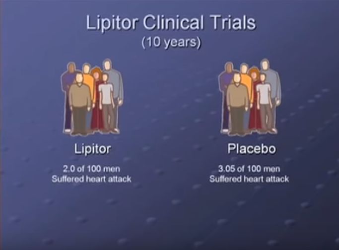 什么意思?就是说,你让100个心脏病高风险的人吃10年立普妥,有可能只能多阻止1个人遭遇心脏病发作。