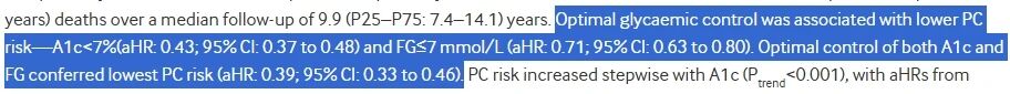 当患者糖化血红蛋白 (HbA1c) < 7% 并且 空腹血糖 (FG) ≤ 7 mmol/L 时,其未来患胰腺癌 (PC, pancreatic cancer) 的风险显著降低。