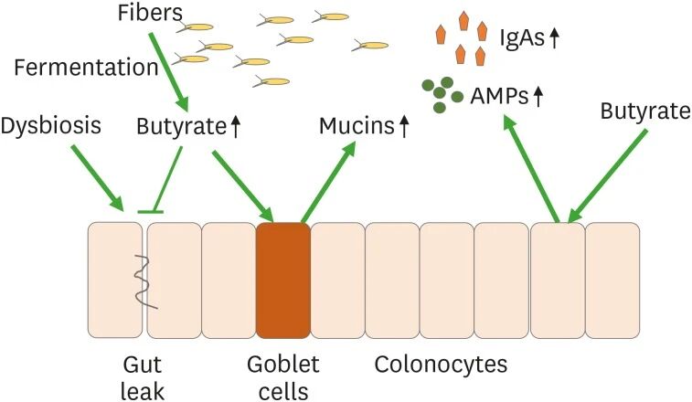 由纤维通过细菌发酵产生的丁酸盐会刺激杯状细胞产生粘蛋白,丁酸盐还会刺激结肠细胞产生AMP和IgAs。