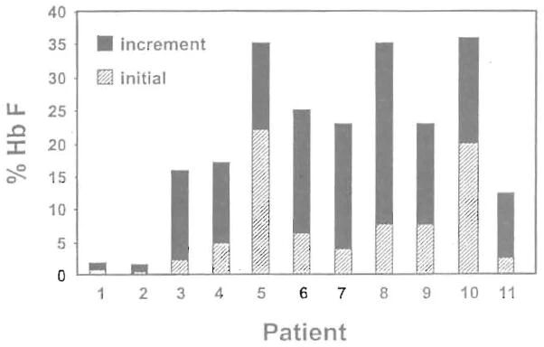 条形图显示了 11 名接受丁酸冲击方案的患者的初始 Hb F 水平 (▨) 和治疗期间 Hb F 的增加
