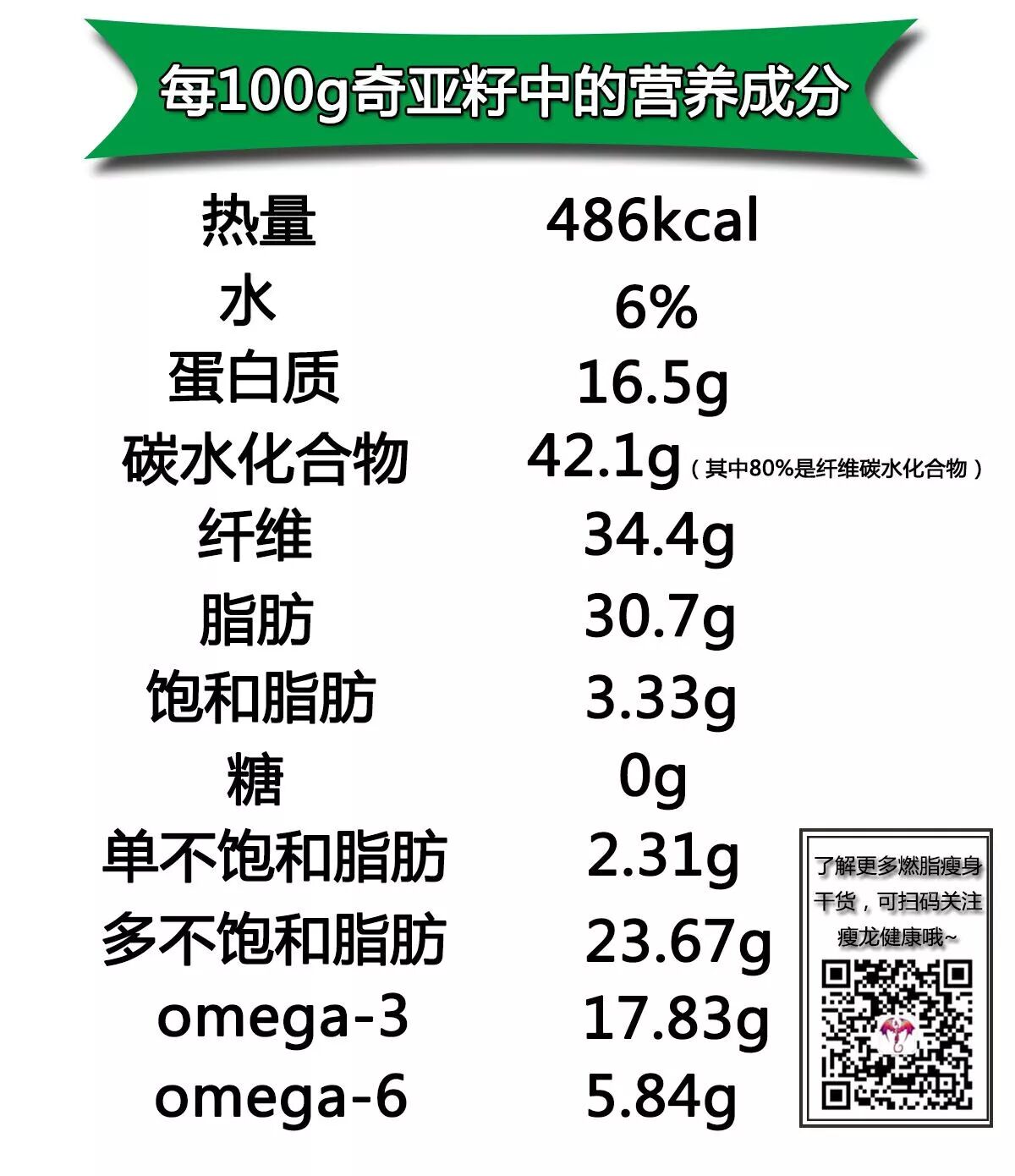 奇亚籽的脂肪中,约75%的脂肪由omega-3组成,其中约20%由omega-6组成。