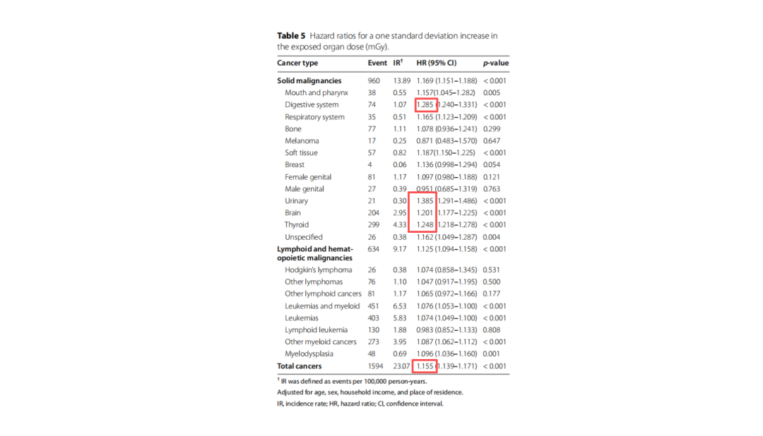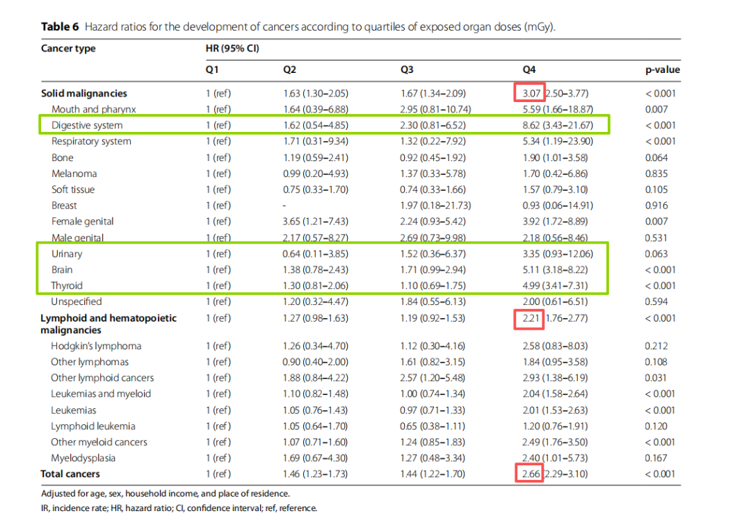 其中,实体恶性肿瘤,最高剂量组的风险是最低剂量组的3.07倍,同样,风险最高的是泌尿系统癌、甲状腺癌、脑癌和消化系统的癌症;