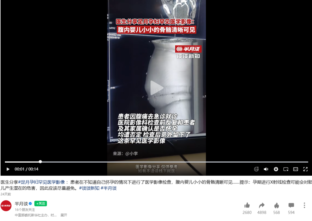 最近有个新闻👇,19岁女性,因为腹痛到医院急诊就诊,医生反复确定是否怀孕,但患者和家属都否认,急诊医生给开了腹部CT检查。