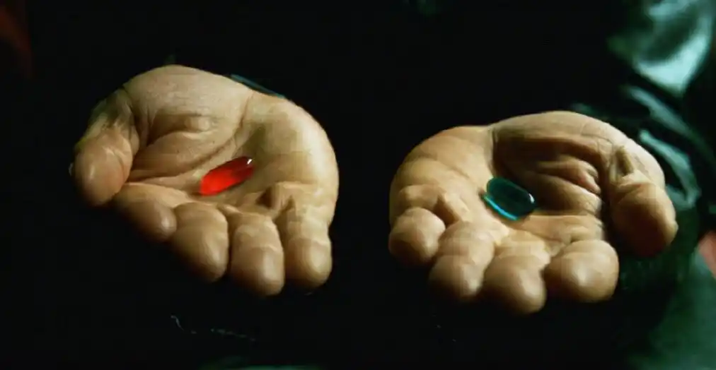 在经典科幻电影《黑客帝国》中,墨菲斯递给了尼奥两颗药丸: