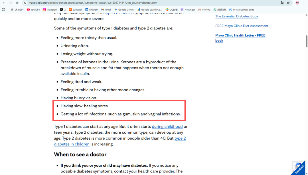 多家权威医学机构,包括美国疾病控制与预防中心(CDC)、美国糖尿病协会(ADA)以及世界著名的梅奥诊所(Mayo Clinic),都将“伤口愈合慢、反复感染”列为糖尿病的常见表现。③