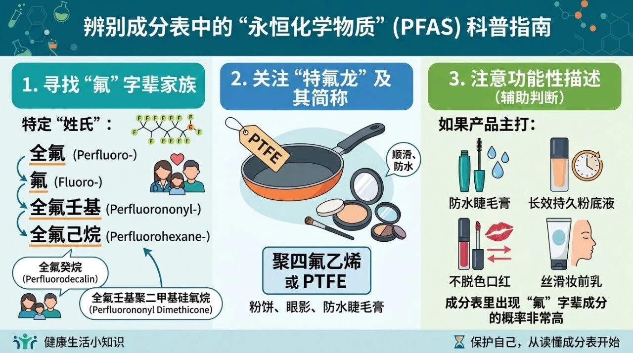 用作化妆品成分的一些常见PFAS,包括比如PTFE(聚四氟乙烯)、全氟辛基三乙氧基硅烷、全氟壬基聚二甲基硅氧烷、全氟萘烷和全氟己烷等等。