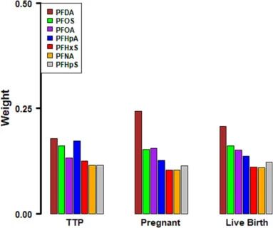 并使用贝叶斯加权分位数和 (BWQS) 回归来评估 PFAS 混合物与生育结果的关联。