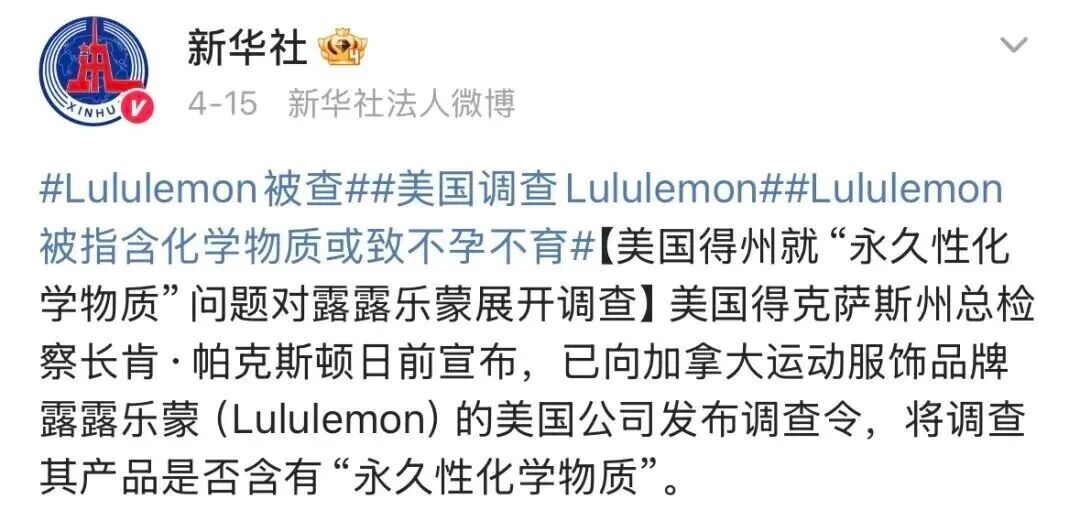lululemon此次涉事的致癌争议成分,是全氟及多氟烷基物质(PFAS),俗称永久化学物。