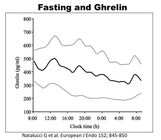 从这个图片中可以看出,饥饿素在早上9.00的时候最低,这也是符合生理和昼夜节律的,一般情况下,很多人早上起来根本就不饿。