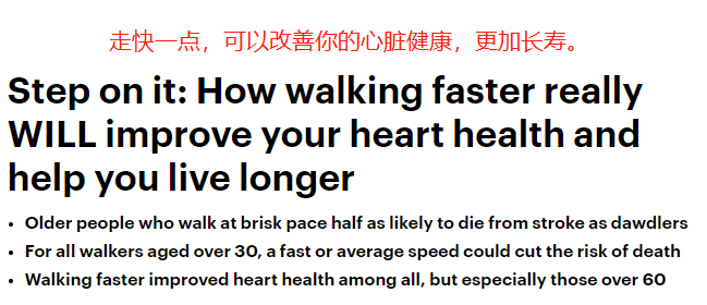 2018年6月份,英国的另一项研究发现,走快一点,可以帮助您降低心血管疾病风险,活得更长。③