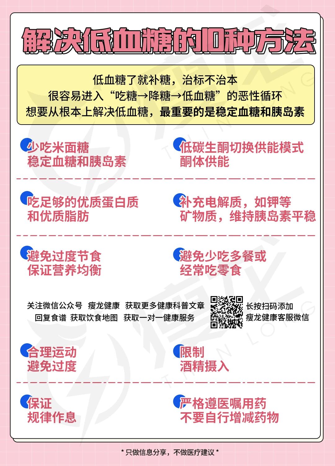 低血糖了就补糖,属于治标不治本,最重要的还是要稳定血糖和胰岛素,少吃米面糖,吃够优质蛋白、优质脂肪。