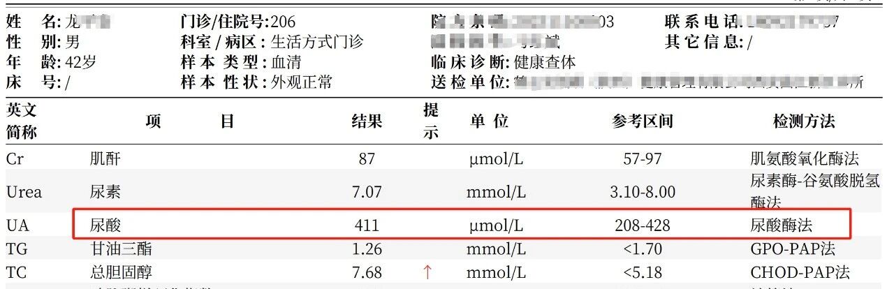 我觉得我这辈子肯定会被痛风折磨,我现在体检的尿酸指标不低,400左右,但是没有想到我43岁了,从来没有痛风过。
