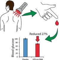研究发现,通过 670nm 红光照射人体背部肌肉 15 分钟,受试者葡萄糖摄入后 2 小时内的血糖升高幅度降低了 27.7%,最大血糖峰值降低了 7.5%。