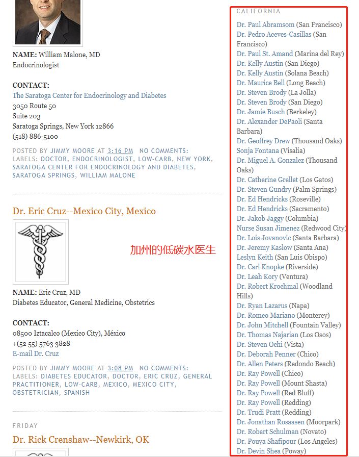 目前,国外利用『低碳饮食治疗糖尿病』等代谢性疾病的医生,越来越多,最近看到一篇文章,有人汇总了国外的低碳医生,主要在美国,还有加拿大,南非,中东等国家,美国有的州,就有十几个这样低碳医生,文后会给大家链接。②