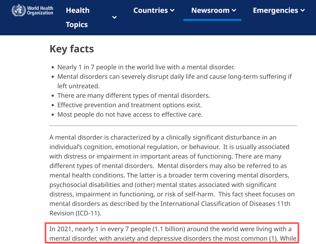 根据世界卫生组织最新发布的文章,全球约有11亿人正遭受精神相关疾病的困扰。