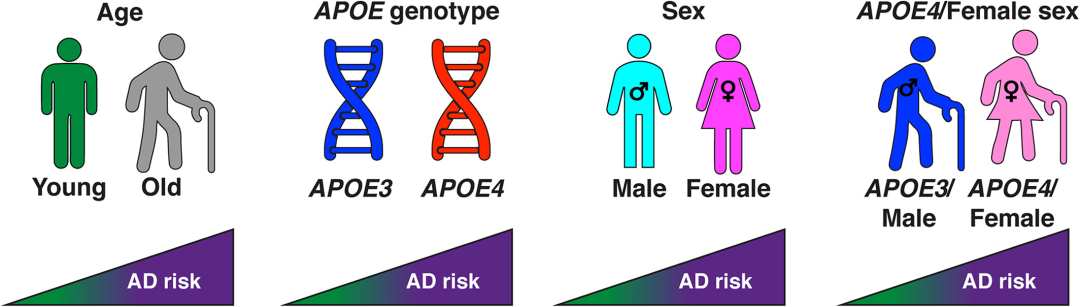 而携带APOE4基因的人得AD的风险特别高。尤其是女性,不仅更容易得病,而且病情发展更快。
