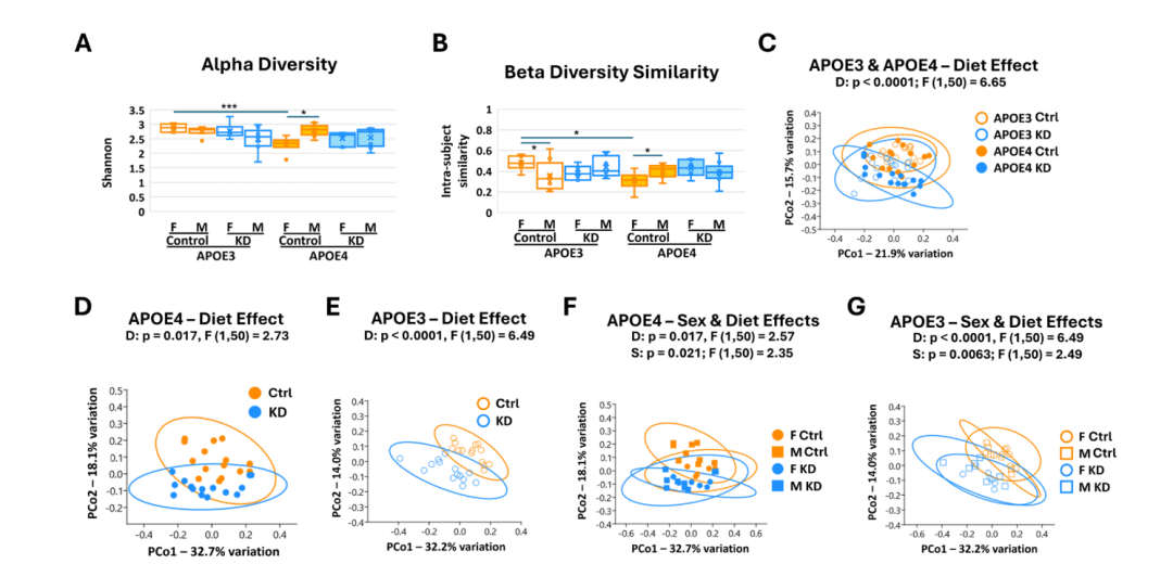 研究结果发现:在APOE4雌性小鼠中,KD组的肠道菌群多样性恢复了,几乎接近正常水平,这种改善在APOE4雌性小鼠最明显。