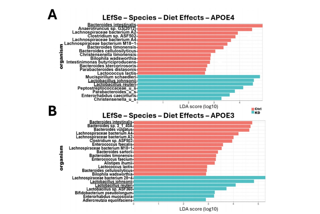 生酮饮食,增加了有益菌,如Lactobacillus johnsonii 和 L. reuteri;减少了潜在致病菌,如Bacteroides intestinalis👇