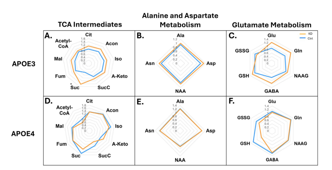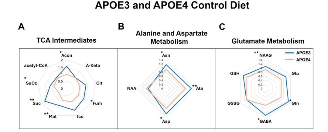 生酮饮食恢复了APOE4小鼠脑中多个关键代谢产物的水平: