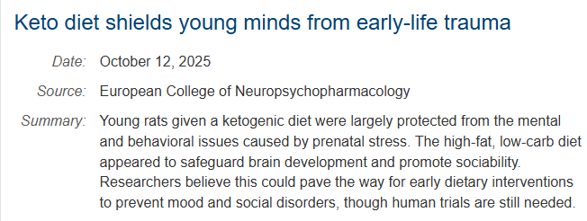 对于经历孕期应激(prenatal stress)的小鼠(大鼠)后代。在断奶后给予生酮饮食,能显著减少其成年早期出现的行为和心理问题。④