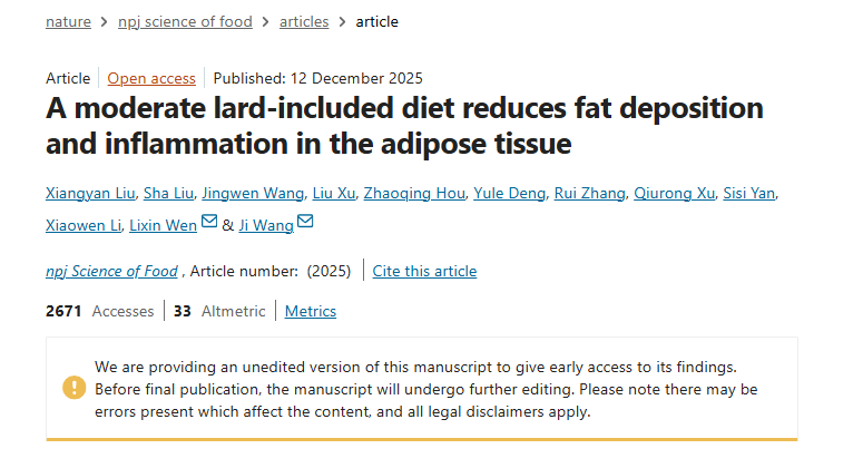 湖南农业大学团队,在nature上新发表研究,证实猪油不仅能抗炎,而且有利于脂肪分解,控制体重。