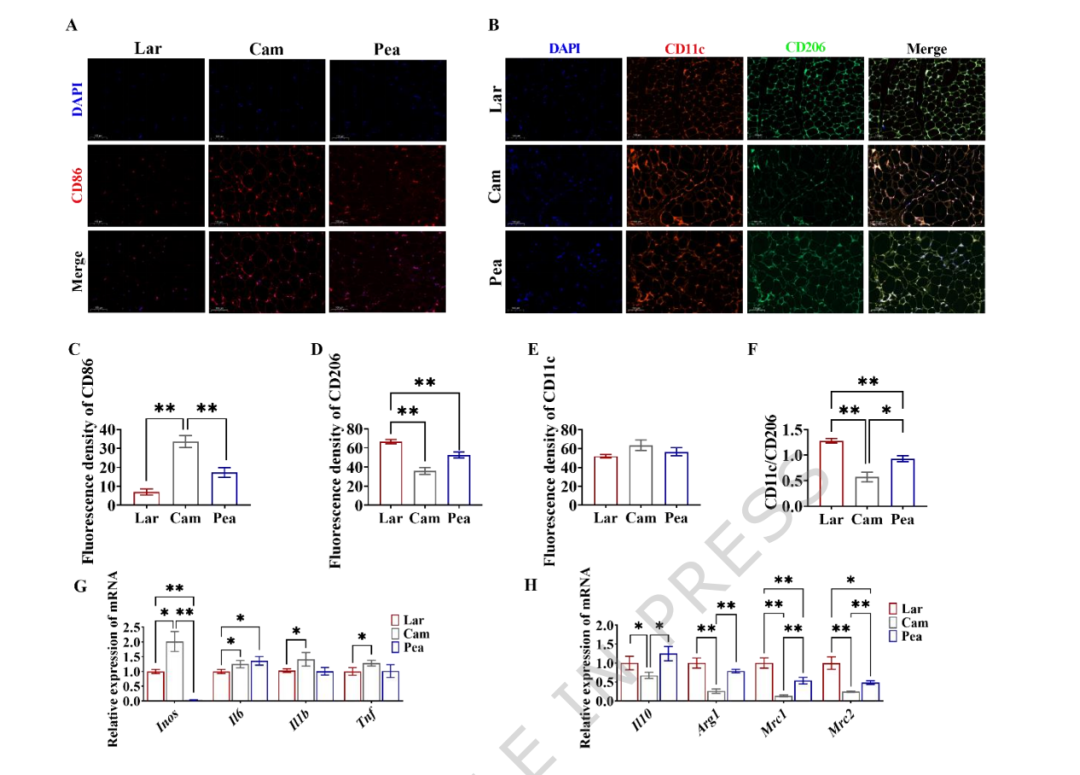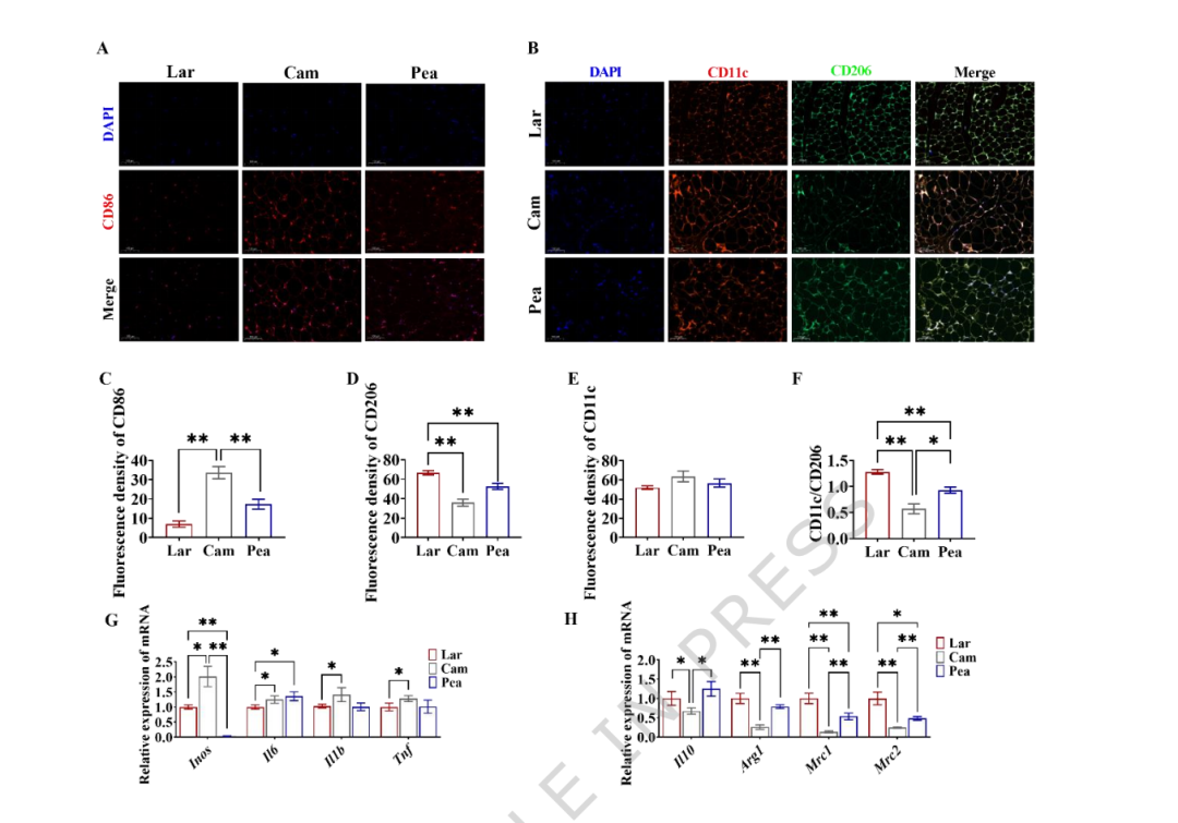 相比之下,摄入山茶油和花生油的小鼠脂肪组织中,促炎的M1型巨噬细胞(标志物为 CD86, Inos, Tnf, Il1b)水平更高 。