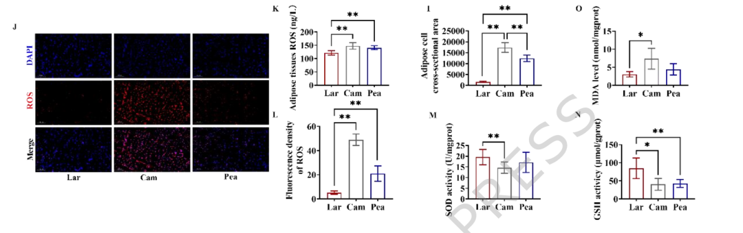 猪油组脂肪组织中的活性氧(ROS)水平也显著低于山茶油组和花生油组 。