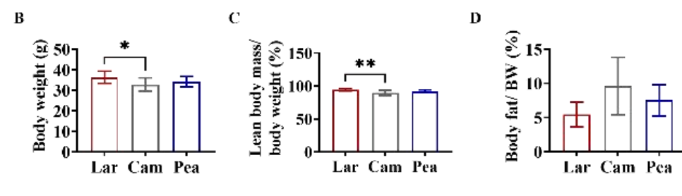 与另外的2组植物油相比,猪油组小鼠虽然体重较高,但其精益体重(Lean body mass,LBM)比例显著增加。