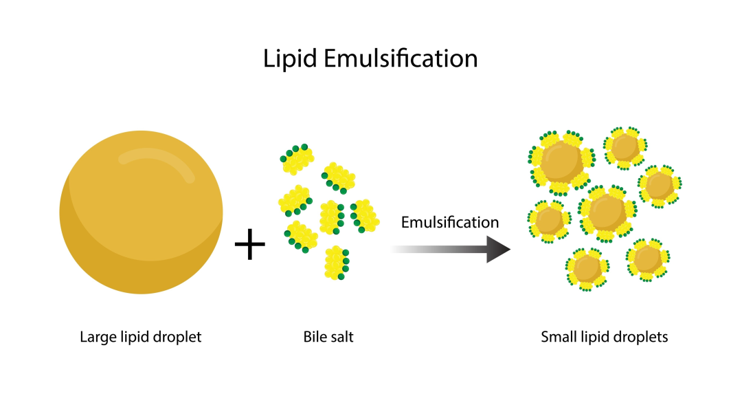 当你在进食含油脂的食物后,胆囊会释放胆汁进入小肠。TCA 能将大块的脂肪颗粒乳化成微小的脂滴,增加脂肪酶的接触面积。
