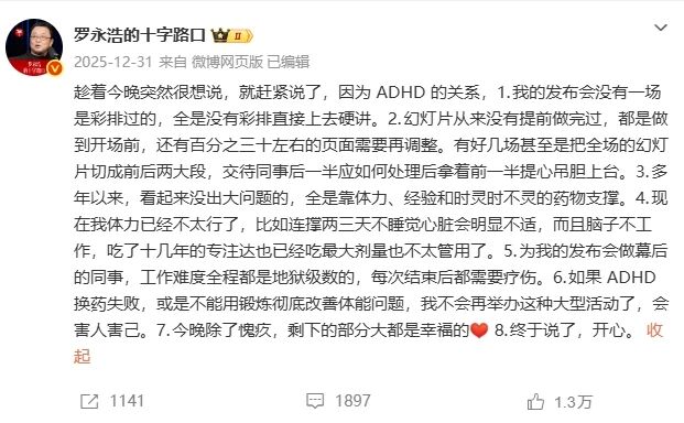 一向以逻辑缜密、口才犀利著称的罗永浩,这次不是和别人“战斗”,而是“自爆”患有ADHD(注意缺陷多动障碍)。他坦言,自己长期以来都在与这种“神经发育障碍”共存。