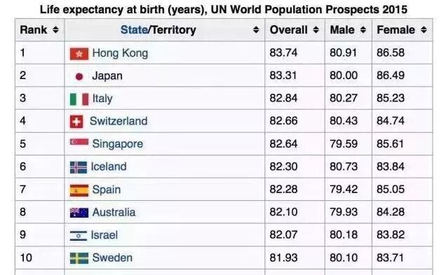 根据联合国经济和社会事务部公布数据显示:香港是世界人均预期寿命最长地区。