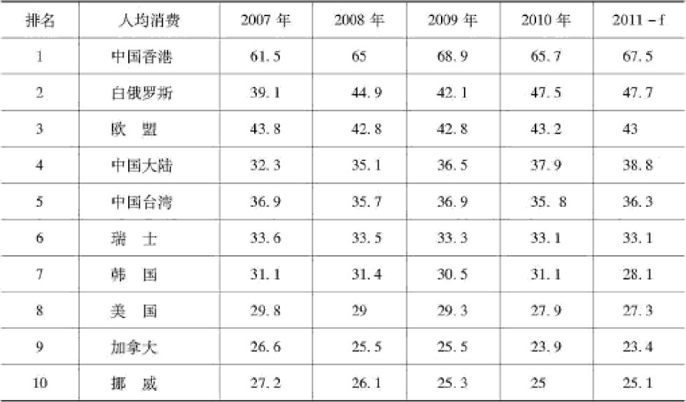 (世界上人均猪肉消费量前十位国家和地区单位:kg/人/年)
