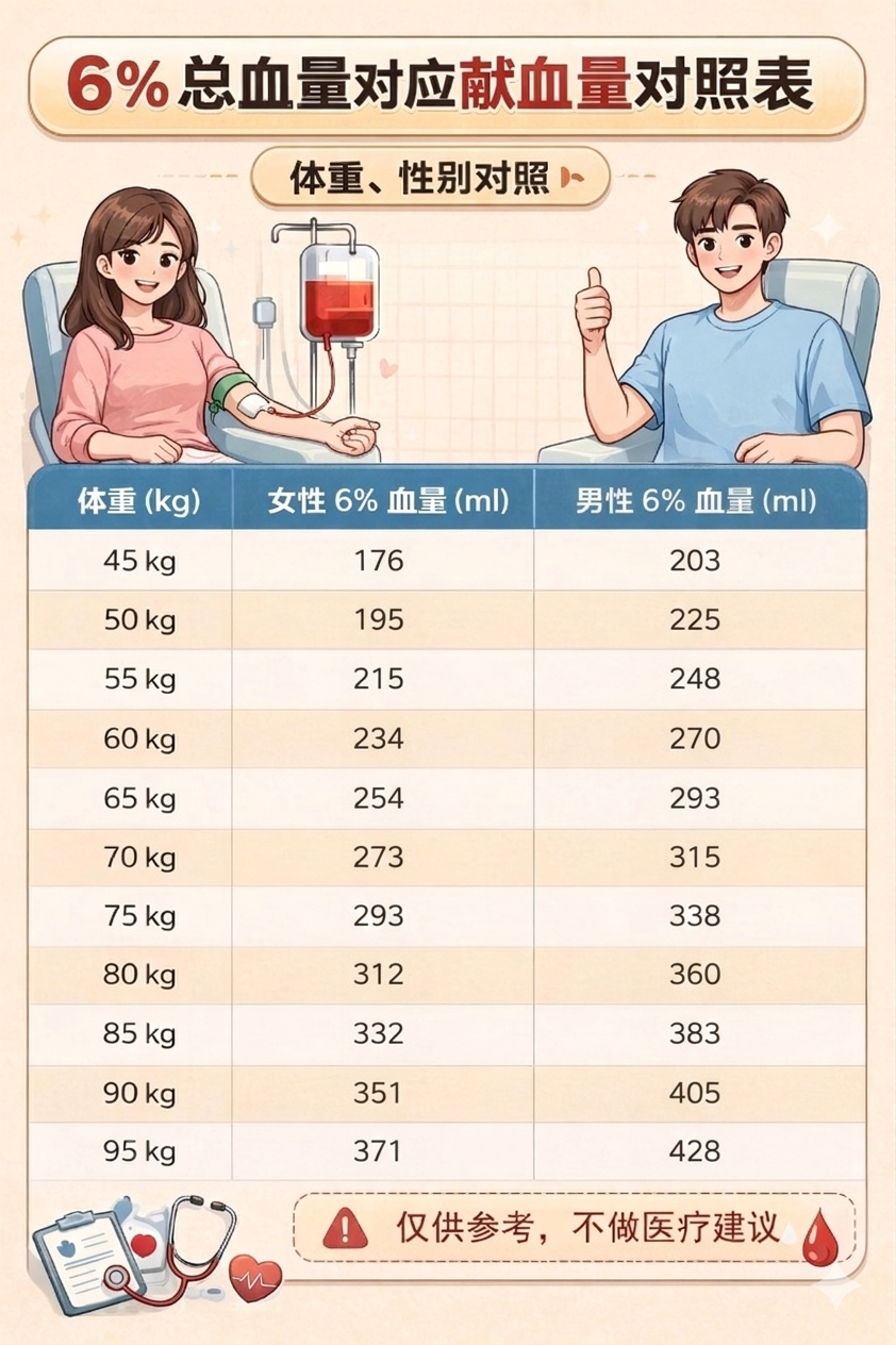 下面是男女6%总血量大致对应的献血量,大家可以参考一下: