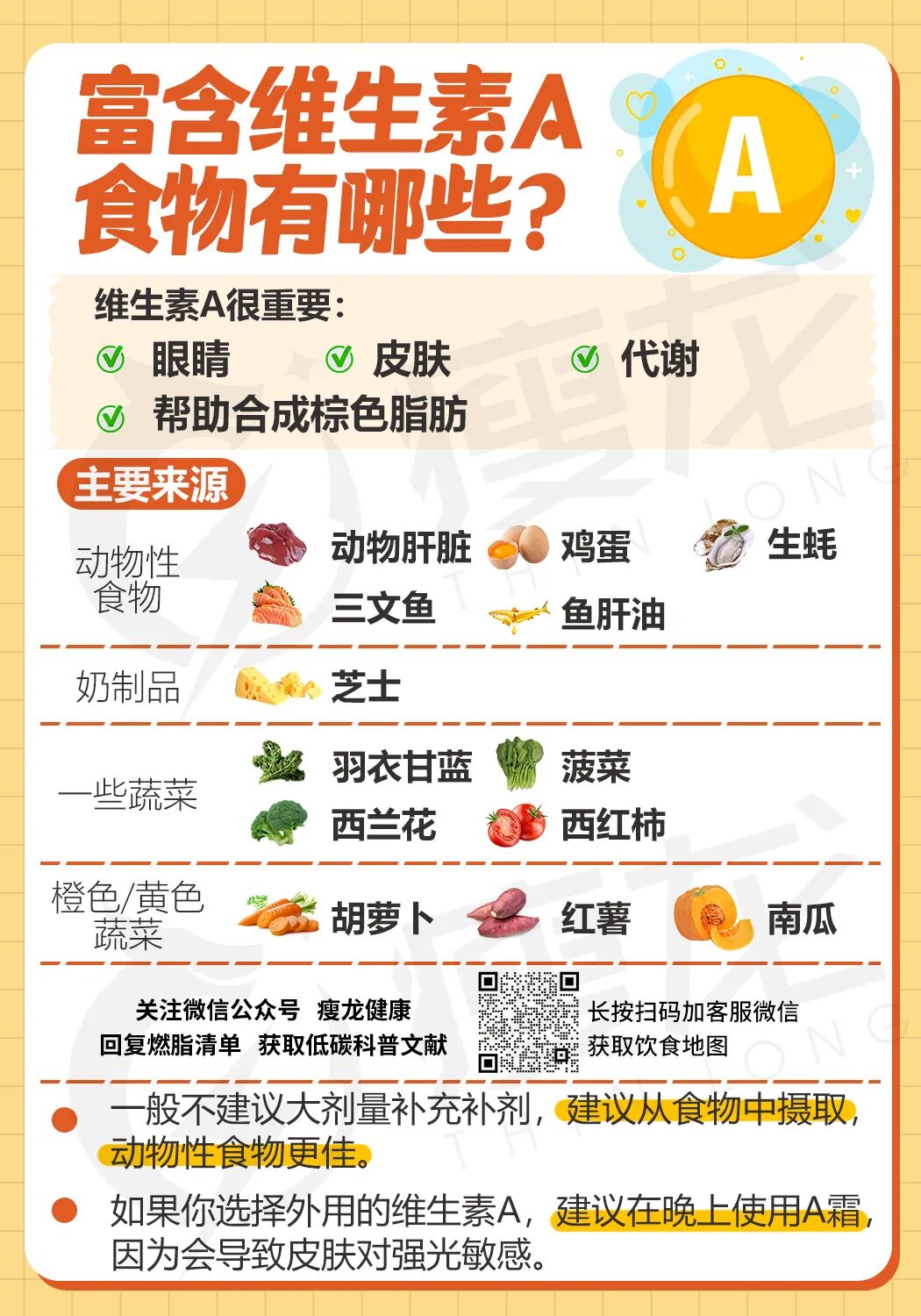 动物性维生素A来源包括:动物肝脏,如牛肝、鸡肝,鸡蛋,无糖全脂酸奶,鱼肝油。
