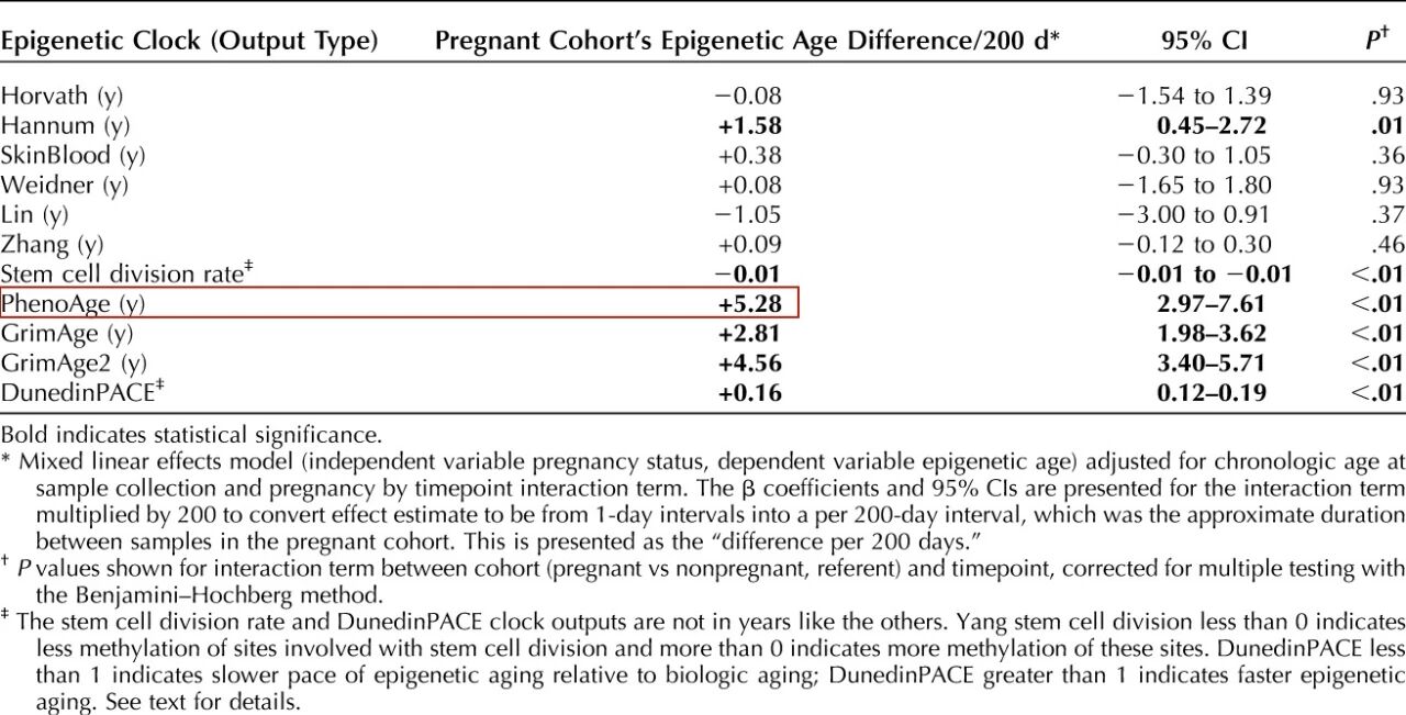 在这些时钟中,PhenoAge指标(表型年龄)显示怀孕约200天期间表观遗传年龄累计加速约5.28年,也就是说,相同的时间里这些细胞分子标志表现得像“老了5年多”。