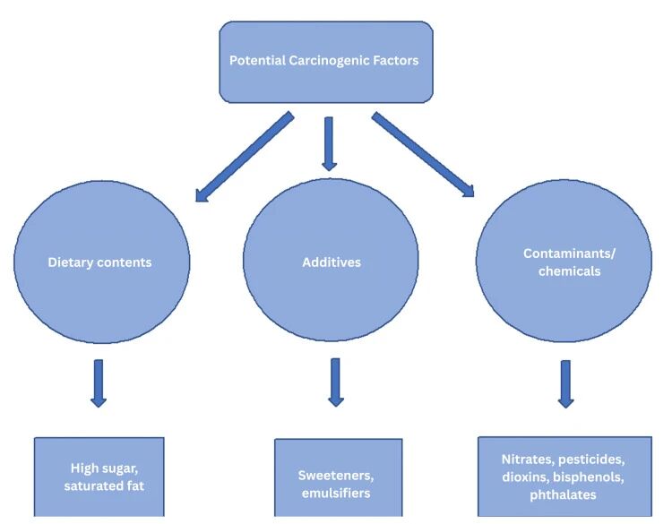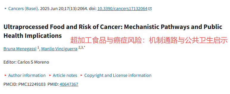 综述总结了,超加工食品通过引发长期炎症、破坏肠道菌群、损伤DNA 和干扰细胞调控,逐步形成一个适合癌症生长的内部环境,从而显著提高癌症风险。③