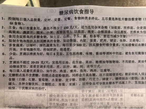 我又看了一下他出院时医院给的“糖尿病饮食指导”,我陷入了深深地悲哀之中,如此用药,如此饮食,糖尿病必然会越来越重啊,北京三甲医院的内分泌专家尚且如此,我辈任重道远!