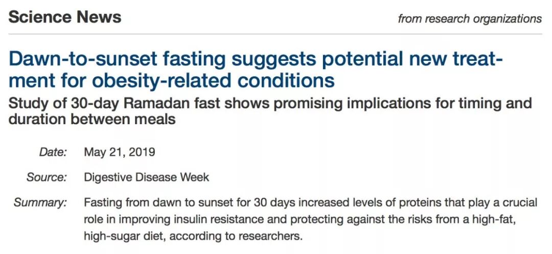 在刚过去的2019年5月份,消化疾病协会(DigestiveDisease Week)公布了一项最新的针对斋戒的实证研究,有关白天的断食对健康的影响。①
