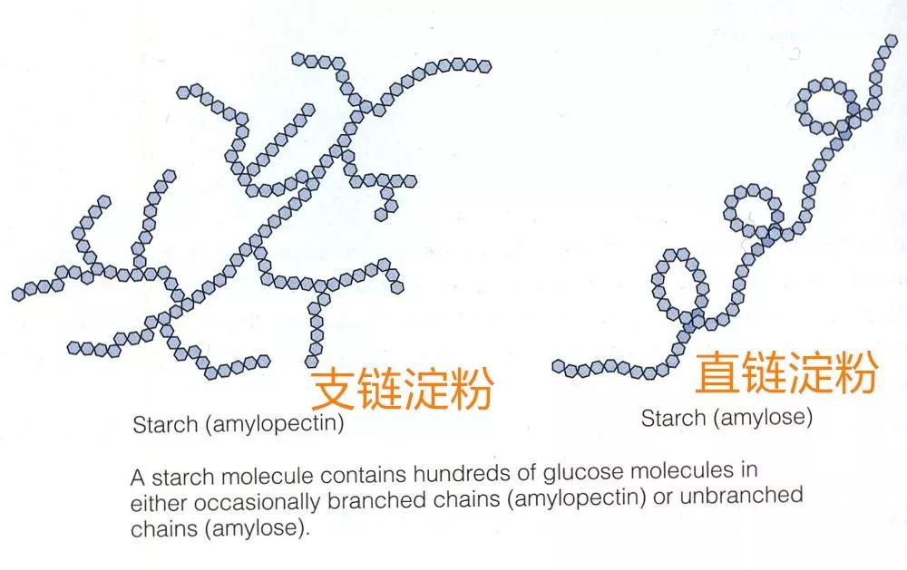 我们从图中可以看出,直链淀粉是长的,直的,而支链淀粉有非常多的分支,这样的结构差异,导致两种淀粉的特性不一样。