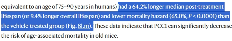 这项研究表明:PCC1 不仅可以在细胞水平上“识别并清除衰老细胞”,也在动物体内改善功能衰退、延寿。