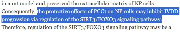 PCC1 通过激活 SIRT3/FOXO3 信号通路,修复线粒体动态、抑制坏的自噬/凋亡过程,从而减轻细胞退变。④