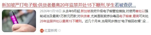 “新加坡严打电子烟:供货者最高20年监禁并处15下鞭刑,学生或遭开除甚至施以鞭刑。”