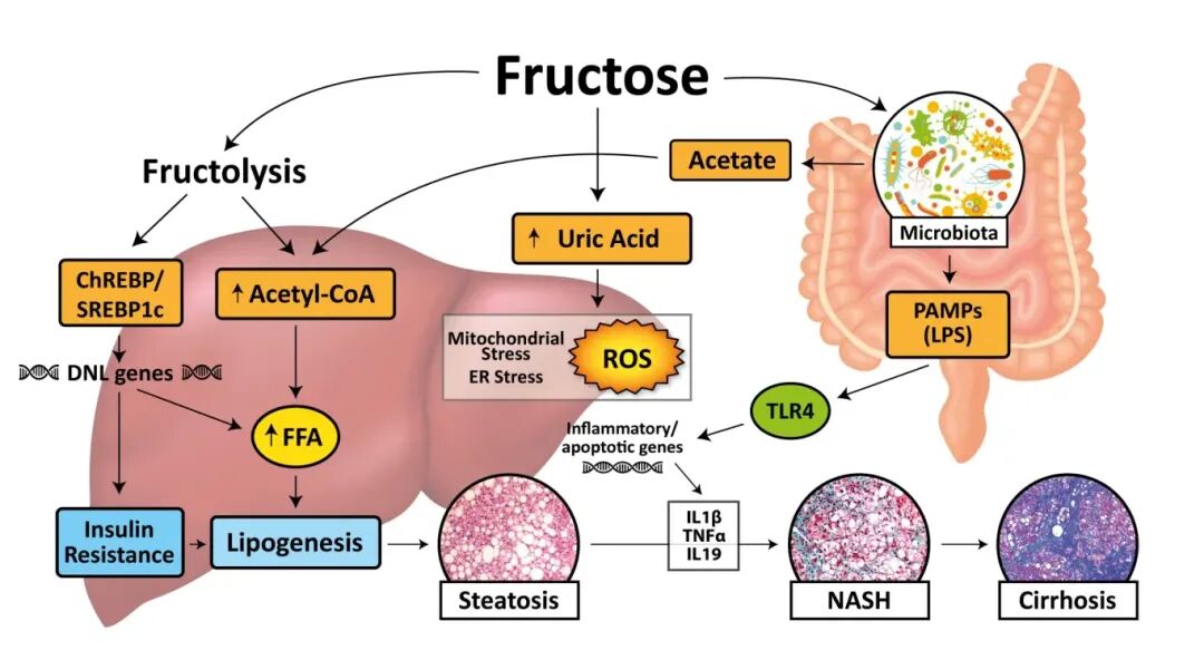 大量果糖涌入肝脏,会迅速被转化为脂肪,直接导致脂肪在肝细胞内堆积,形成非酒精性脂肪肝。③